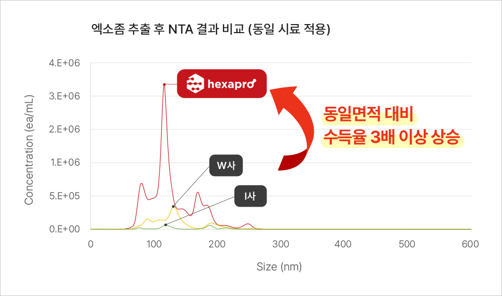 HCT116 배양액에서 엑소좀(크기 50-200nm) 분리를 위한 필터링 후의 샘플에 대해 입도 측정 수행했을 때 동일 면적 조건 테스트에서 헥사프로 AAO가 타사AAO 대비 200nm 이상 영역에서의 분리되는 입자 빈도가 가장 낮고 수득율도 3배 이상 높은 성능을 확인